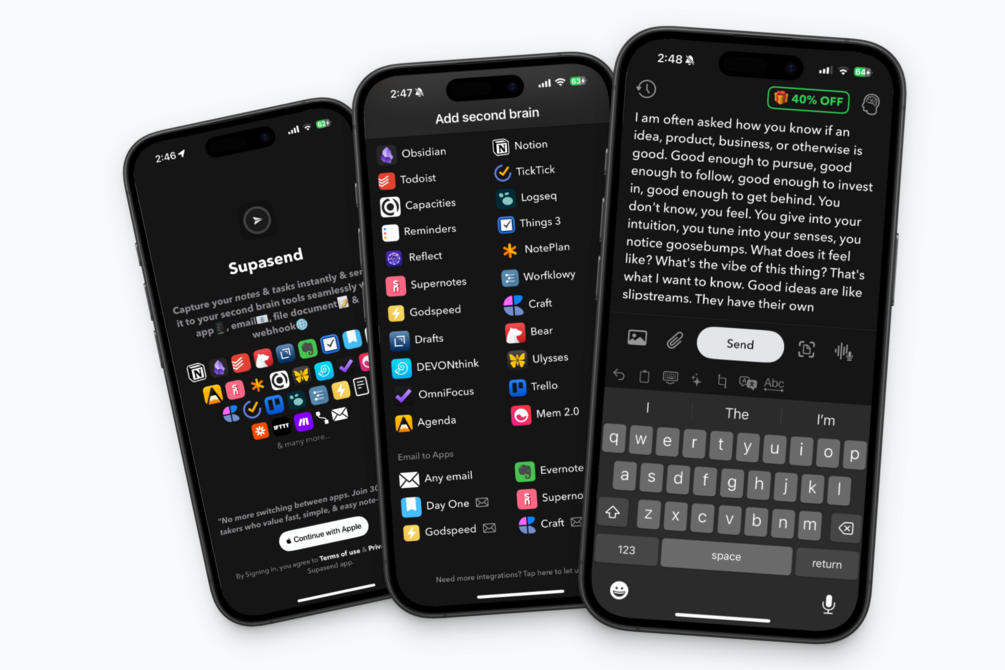 Well thoughts don't wait for apps to load. Your ideas move faster💨 than your apps.Imagine capturing a note, idea or a moment instantly & sending it seamlessely to your note taking apps before its gone, well thats where Supasend app comes in. With over a 20+ apps in second brain to choose from, you can use Supasend as a note-to-self app to capture & send anywhere is just a snap. It is that easy.